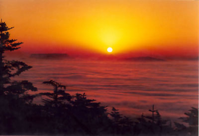 金頂日出,和佛寺的鐘聲同步而起。天剛破曉,東方碧藍(lán)藍(lán)的天空,在靠近地平線那兒橫抹著一道直直的銀光,把天和地區(qū)分開來,徐徐地上下擴展著。忽而,從天地的縫隙里撞出了一條咖啡色的光帶。這江帶漸漸由深變淺,由凝重的色調(diào)變得更加明快,由曙紅變金黃,好像熔化了的金水在緩緩地傾瀉流淌。剎時間,幾道光束像閃閃利劍劃破了這紫藍(lán)色的天幕。此時,橙黃色的云,朱紅色的云,都被鑲嵌上亮晶晶的金色花邊,相互交錯重疊,把道道光束橫剪成了幾段,向高空不斷地延展。殷紅的太陽籠罩在一層層暗紫色的薄紗里。忽然,輕輕地撩起這紫色的面紗,露出好那紅紅的面龐。這紅色的朝陽和銀色的月光,有著異色同工之妙,它溫柔熱情,真令人神情頓爽。這時的朝陽憑著自身的活力,不斷地穿透一道又一道的云彩,一個跳躍接著一個跳躍,冉冉地升上了地平線,把紫色的云,紅色的云,黃色的云……推向遙遠(yuǎn)的天邊,巧疊成千奇百狀的彩色”山巒“。在這些”山巒“的下邊,好像有一條黃橙橙的天河,在微微地流動著,朝陽正灑浴在這條天河里,向上浮起,浮起,悠閑地浮出了這天河的水平面,似乎猛地一躍,帶著天河里的金水,濕漉漉的升向高空,露出橢圓圓的、紅潤潤的笑容。然后很快升高,很快變得渾圓渾圓,很快收斂了笑容,放射出刺眼的光芒,刺得人眼花繚亂,千山萬嶺金色一片。此刻,滿天的彩霞,殷紅的朝陽,玉白的雪山,珊瑚色的”峨眉山頂“,浩大的綿綿云海,構(gòu)成了一幅極為壯麗的天然畫卷。