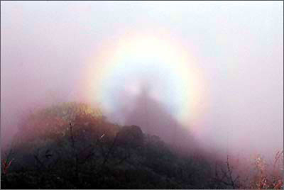 為什么會身影自見呢?主要原因是:雖然云層中的水滴和冰晶點很多,但人們各自所見的光環,只是各自所見為頂點的那個光錐面的水滴和冰晶點作用的結果。也就是各自照著一面小小的圓鏡,自然照見的只是各自的身影。由于這種自然現象出現的地理位置、環境、時間、形態、色彩多種多樣,這只能說明環形“攝身光”的成因。這種環形彩光,常見于峨眉山第二主動峰的金頂,19世紀初,科學界定名為“峨眉寶光”。