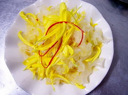 配料:主料:銀耳 輔料:黃菊花、青紅椒絲 調(diào)料:濃縮橙汁、糖漿(白糖、白醋、清水熬制)制作方法: 銀耳用水泡發(fā),摘洗干凈,焯水,過涼; 把主配調(diào)料拌勻即可。">