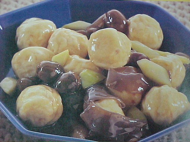 1、馬鈴薯洗凈,入蒸籠蒸80分鐘,取出剝皮,搓成泥,拌入地瓜粉,調料 1料,用 手搓成小圓球,入蒸籠蒸8分鐘取出。 2、木耳切片,蜜瓜切菱形小塊,龍眼干加清水3大匙,一起入蒸籠蒸40分 鐘取出。 3、以2大匙沙拉油爆香姜末后,入作法2料,一起微燜片刻,加入作法1 球,調料2料 即成。