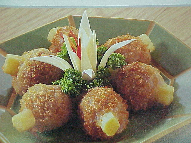 材料:甘蔗200克,馬鈴薯200克,香菇2朵,素火腿,紅蘿卜各30克,玉米粉1大匙,面包粉 150克 調料:鹽,糖各半匙,麻油,胡椒粉各1/4匙,素沙拉醬2大匙。