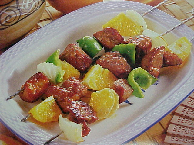 1、將素肉塊發水,用調料煮好,調味。 2、將青椒,芹菜洗凈,橙去皮,分別切與肉塊相當的塊狀。 3、用烤肉串將素肉塊及其他材料交叉串好,再用錫箔紙包住,放入烤箱, 以180度 烤15-18分鐘即可,除去錫箔紙,排列盤上即可。