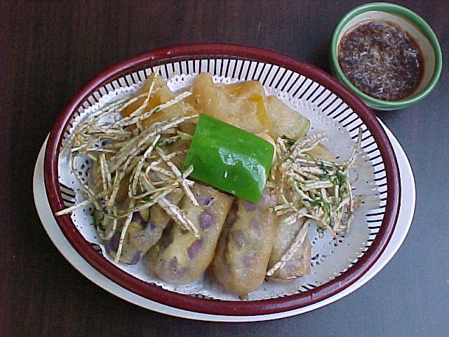 1、南瓜,茄子,青椒,藕,口蘑,均勻切片,掛糊后入油鍋中炸酥。 2、白蘿卜放入A料打磨成糊,用作蘸料。 3、香芋絲炸酥,與作法1料裝盤,蘸作法2料食用。