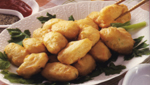 ?。?、待油鍋再加熱,投入炸好的枇杷豆腐快速酥炸一次,立即撈出,瀝干油分,盛入盤中,即可醮E料食用。