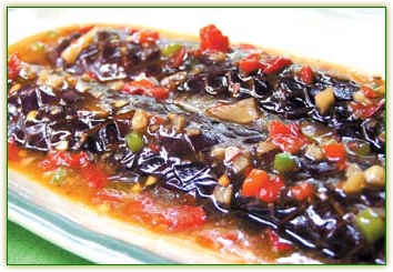 做法:茄子1條一開二,皮面先開十字花刀,放入油鍋中炸至金黃色,起鍋備用;起鍋放油,下青紅椒、泡椒、豆瓣醬炒香,與炸透的茄子一起燒20秒,調味,勾薄芡即可。