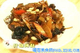 主料:熟面筋400克 輔料:花生米、水發木耳、胡蘿卜、冬筍、水發黃花菜、香菇 調料:鹽、醬油、白糖、桂皮、姜片、料酒、素鮮湯、食用油