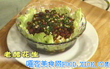 4、取一個喇叭形的碗,生菜絲、香干丁墊底,放上炸好的花生米,在倒入調好的汁拌均勻即可食用。