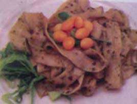 材料∶寬帶面六○○克、百果十粒、香菜少許、蘿蔓生菜一片。
