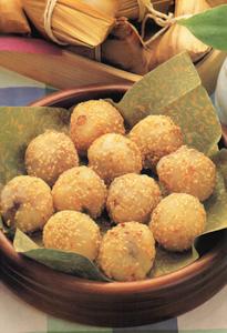 【材料】 白芝麻100公克,豆沙200公克、糖粉150公克、玉米粉100公克、糯米粉400公克 【調味料】 油少許 【要領】 滾黏芝麻時,要稍微壓一下,將芝麻壓進面團內,免的炸時芝麻掉光光。 【做法】 A、玉米粉加1/2杯熱開水扮成漿狀后,再加入糯米粉、糖粉、油、及清水適量扮揉成面團,并一旁醒面。 B、將醒好的面團分切成適當大小的等分,再分別包入豆沙并搓揉成圓球狀,然后一一滾黏上白芝麻。 C、芝麻球放入熱油中,炸至呈金黃色即可撈起食用。 |