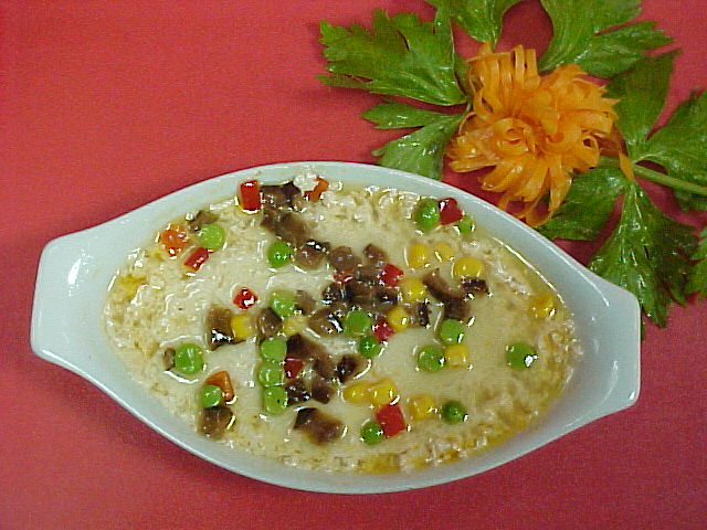 配料:原料:內脂豆腐半盒,蘑芋片少許,青豆10粒,香菇3朵, 玉米粒10粒,紅椒丁少許 調料:鹽1茶匙,胡椒半茶匙,素雞粉1茶匙