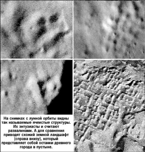 照片左側(cè)為從月球軌道看到的所謂蜂窩狀結(jié)構(gòu),有人認(rèn)為是人類(lèi)遺跡,右下側(cè)是作為比較的地球無(wú)人區(qū)的人類(lèi)遺跡衛(wèi)星圖。 |