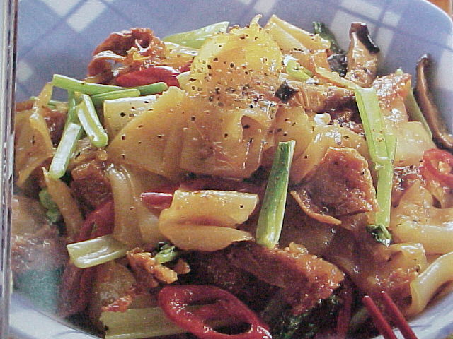 1、河粉切2公分寬條,并使其松散開,香菇洗凈泡軟,切條,素肉過水, 泡軟,擠干水分切條,油菜切段,辣椒切斜片,紅蘿卜切片。 2、起油鍋,炒香菇,素肉及紅蘿卜片,并加入素蠔油,素沙茶及黑胡椒 拌炒,倒入河粉,輕輕翻炒。 3、最后將油菜,辣椒放入炒勻,起鍋前加入少許香油即可。