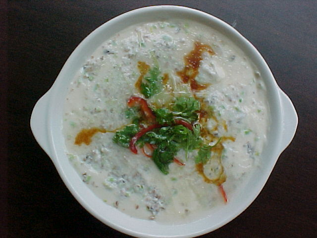 1、將豆腐,青豆,草菇,素肉醬放入打磨機磨成粗狀末,放入盤中蒸20分鐘定型。 2、放入姜絲點綴,滴香油于表皮即可。