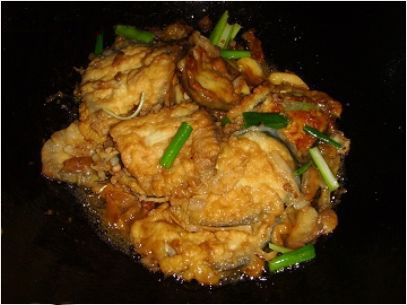 1.將茄子洗凈、去皮、切條,用冷水浸泡、撈出,瀝干,青柿子椒切片。 2.煎鍋倒入花生油,燒六成熟,放入茄子條油煎,待煎至兩面金黃時,改用小火、放入青椒片,倒入番茄醬炒勻、再放入胡椒粉、奶酪、加蓋煨20分鐘,待茄條熟軟,出鍋入盤。