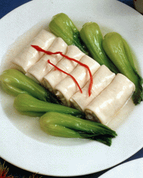 4、青江菜取嫩心部份下鍋加調味料用2杯水煮熟,取出圍繞盤邊。剩余的湯汁以太白粉水及香油勾成芡汁。