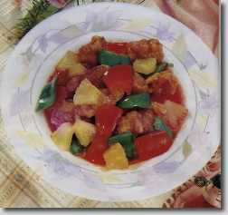 制作方法:制法 1、芋頭去皮洗凈切細條,油條切小段,鳳梨片、青椒、紅椒均切丁。 2、芋頭先用油炸過后,每段油條塞入1小條芋頭。 3、面粉加水調成糊狀,再將油條一一蘸面糊入5分熱油鍋慢慢炸酥,撈出瀝油。 4、起油鍋,倒入鳳梨丁、青椒丁、紅椒丁略炒后盛起,將油條加入鹽、糖、醋、番茄醬、水半杯燜煮至入味后,加鳳梨、青椒、紅椒丁稍拌后用淀粉水勾芡,淋上香油即可。