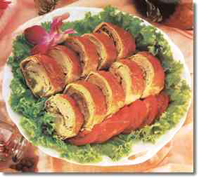 3、備一長(zhǎng)盤,中間、兩旁各置放兩頁豆腐皮,淋入a料后,平鋪炒好的餡料,并卷成長(zhǎng)形,放入蒸鍋蒸3分鐘后,即可取出待涼。