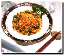 配料:特色:此菜色澤艷麗,口味鮮香,含多種營養成份。 主料:玉米粒200克,青豆30克,胡蘿卜40克,泡開香菇3朵,素蝦仁(酡仁)4粒(用其它魔芋制品亦可) 調味料:精鹽1/2小匙,味素1/3小匙,香油1小匙