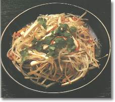 制法 1、榨菜切絲,用清水洗凈。 2、適量之水燒開,放下銀芽燙軟撈起,滴干水。 3、紅椒絲、豆腐干、榨菜、姜絲一起放入開水中燙2分鐘撈起,滴干水。 4、把銀芽、豆腐干、榨菜、姜絲、椒絲加汁用料調勻盛碟上,灑上香菜,冷熱吃均可。