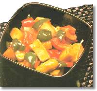 配料:用料:豆腐干3件,青椒1只切塊,紅椒2只切件,番茄2只去心切塊 調(diào)味料:水6湯匙,醋2湯匙,糖2湯匙,鹽1/4茶匙,生粉1茶匙
