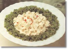 制法 1、雪里蕻用水浸片刻,洗凈后擠干水分,切細粒,煮熟,去汁。 2、豆腐切粒,用調味料浸著放冰箱內約2小時,取出,瀝干水分放碟上,再以雪里蕻圍邊,撒下紅辣椒茸,即成。 注:雪里蕻切細粒后,用糖1茶匙煮片刻,味道更可口。