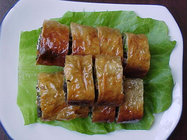 1、黑木耳,胡蘿卜,西芹均勻切絲,將豆腐剪長30公分,寬10公分型。 2、用鹽,素雞粉,糖,將切好的絲調味,用豆腐衣包好后下油鍋煎脆起鍋。