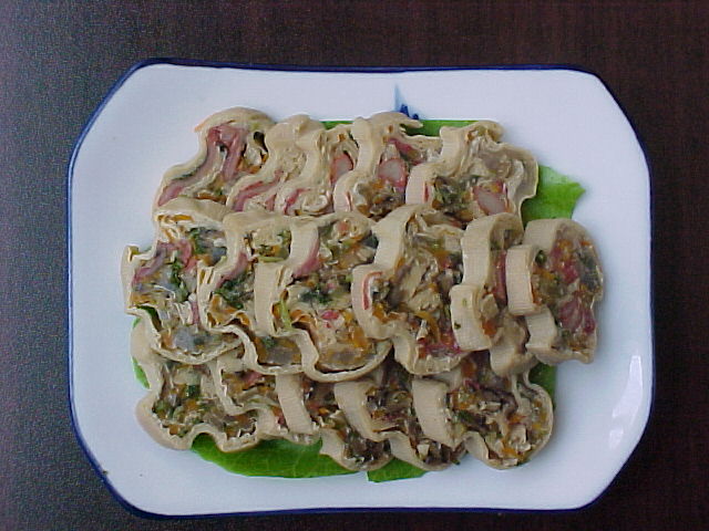 1、素肥腸切絲過油,瓊脂用熱水化開后,再凍成塊狀切絲,胡蘿卜切絲, 豆腐衣剪成長30公分,寬10公分的長方形。 2、素腸,胡蘿卜,瓊脂加鹽,素雞粉,糖調味。 3、豆腐衣將作法2包起來,外用紗布包緊,四周用四根長短相同的棍條綁 在一起,入籠蒸15分鐘即可。