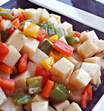 配料:材料:米豆腐、青紅椒、調(diào)味料制作方法: 做法:米豆腐涼水泡一會,然后洗凈,切方丁;彩椒也切同樣大小方粒;然后放香油、花椒油、辣椒油、姜、鹽、生抽等調(diào)味料">