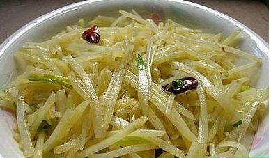 配料:用料: 1、土豆半斤。 2、干辣椒兩個,切段。 3、香菜兩棵。 4、鹽、味精適量。制作方法: 做法:1、土豆切細絲,香菜切段。用清水把土豆絲表面的淀粉漂洗干凈后">
