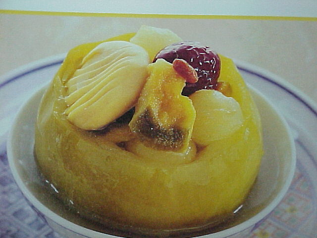 1、洋菇切扇形,放入滾水中汆燙片刻,取出。 2、酸梅干切成小塊,備用。 3、青蘋果切除蒂(約1公分厚),以挖球挖取中間果肉,不只留用一粒粒的 圓形果肉,而且要保持蘋果完整外形。 4、素高湯調味后,注入蘋果盅內,加洋菇,酸梅干和蘋果肉球,用中火清 燉25分鐘即可。