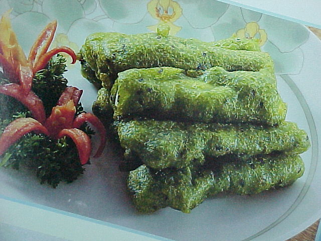 配料:原料:茭白300克,菠菜100克 調(diào)料:鹽1/4茶匙,花生油半匙,五香粉少許 菠菜面糊:菠菜葉汁410克,低筋面粉300克, 發(fā)粉25克,黑芝麻5克,花生油 半匙。