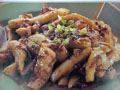 1、茄子去皮,切長(zhǎng)7公分的小段放入水中浸泡(防變色)。 2、香菇泡軟,與素火腿,面腸,姜各切成細(xì)末狀,芹菜切珠花。 3、茄子瀝干水分,下油鍋以145度高溫炸1分鐘,撈出,鍋中放花生油1 大匙,爆香姜末,素火腿,面腸,香菇,加入素高湯1杯,放入炸過(guò)的 茄子微燜3分鐘,加入調(diào)料炒勻起鍋,撒芹菜珠花點(diǎn)綴增香。