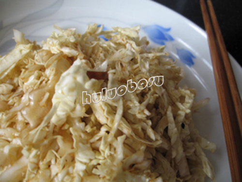 3 將醋、醬油、胡椒粉、辣椒油、鹽、、混勻,澆在白菜絲上。