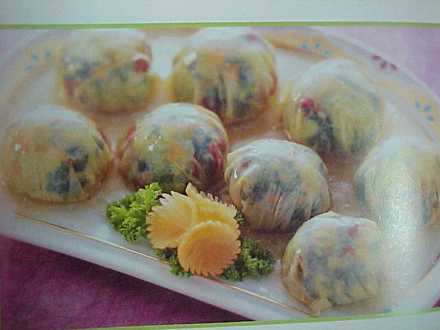 2、豆腐皮切成10公分的四方型數張,放入素高湯中浸泡10分鐘(使質感滑 軟),再瀝干水分。攤開每一張豆腐皮,中間放1大匙已經炒熟的素餡做 成卵狀,將芹菜撕成條狀,綁緊腐包,底部朝下,光滑面朝上放好,入 蒸籠蒸3分鐘,取出扣盤。