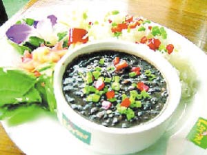 做法:黑豆100克,大米30克,枸杞子3~5克,紅棗5~10個,料酒、姜汁、食鹽各適量。將大米、黑豆入鍋,加水適量,用急火將米煮沸后,改用文火熬至黑豆爛熟,即可取湯飲用,每日早、晚飲用,每次2~3杯為宜,可長期飲用。