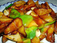 2.茄子洗凈,挖蓋,去籽,填入餡料,蓋上茄蓋,并用淀粉封口,入蒸鍋蒸約10分鐘取出,裝盤,在盤子四周放入油炸核桃仁即成。