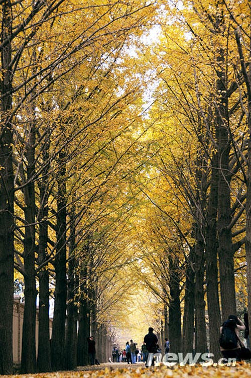 11月8日,游人在北京釣魚臺國賓館東墻外的銀杏林游玩。隨著立冬,氣溫下降,北京釣魚臺國賓館附近的銀杏林已是一地金黃,銀杏進入最佳觀賞期,吸引了大量游人觀賞。