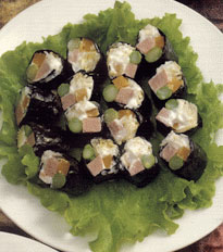 B、紫菜攤開,放入萵苣、蘆筍兩支、素火腿,再擠上沙拉醬,既可包卷起來切成小段排盤供食。
