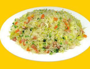3、起熱鍋,放1小匙油,將芹菜丁炒香,加入蘋果丁、番茄、火腿、芹菜及青豆仁、玉米粒、調味料翻炒后,再放進熟米飯,以大火迅速炒勻,即可起鍋食用。以蘋果炒飯是不多見,但此道蘋果素食炒飯,光鮮、美味,又富含多種果蔬纖維,既營養又瘦身。