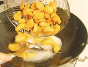 4、如果做拔絲蘋果或香蕉,要先裹上層蛋液或面粉才下鍋油炸,炸時要不斷翻攪,使之炸勻炸透。