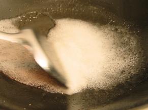 4 倒出鍋內余油,注入250克白糖和1/2碗清水煮沸后,改小火慢熬糖漿并不斷翻炒,直至糖漿的泡沫由大變小,呈濃稠狀且色澤稍變。
