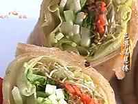 3. 攤開全麥面皮,先鋪上美生菜後,再舖上其他食材,然後灑上適量花生粉及素香松,最後淋上少許沙拉醬,蓋上一片美生菜并卷起,斜切兩半即可食用。