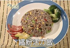 3.炒香九層塔末後,加鹽熄火,倒入十谷飯及甜玉米、蘆筍丁、紅甜椒丁、松子後拌勻。
