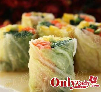 3、攤開一張白菜葉,將胡蘿卜絲、菠菜絲、黃椒絲各放上一些,卷起