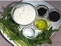 中筋面粉一斤、香菜、芹菜、九層塔、香椿、橄欖油、黑芝麻、 鹽、砂糖、豆腐乳、甜辣醬 。