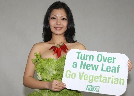 2008年10月23日,蒙古國知名歌手克·諾明晶在烏蘭巴托身著生菜葉做成的長袍為善待動物組織拍攝新一季廣告,呼吁人們吃素食。這將是善待動物組織在蒙古國的首次宣傳活">