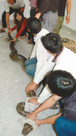 據(jù)養(yǎng)護(hù)人員介紹,經(jīng)過28日的治療后,蟒蛇傷勢已經(jīng)有好轉(zhuǎn)跡象,精神狀態(tài)也明顯好轉(zhuǎn),就在昨日上午10時還胃口大開,一口就吞下了一只活雞。如今除了飼養(yǎng)人員,已經(jīng)沒有誰能輕易地靠近它了。