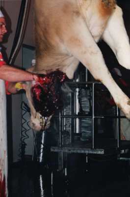 牛還在掙扎,就要被被倒吊,活活被割喉放血致死.