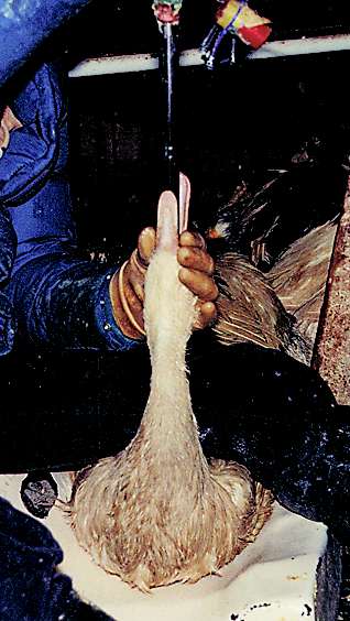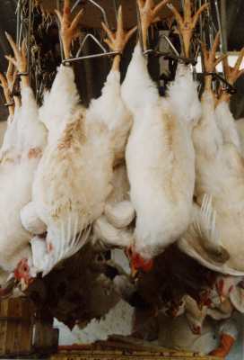 這時被倒吊的雞還是活的,被活活刺喉嚨放血。