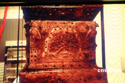 資料圖:十一月二十二日下午三時(shí)二十八分,中國(guó)目前發(fā)現(xiàn)的最大鎏金七寶阿育王塔在瘞藏千年之后,終于在南京各方專(zhuān)家努力下被請(qǐng)出鐵函,驚世亮相。地宮碑文中記載的金棺銀槨及舍利等驚世圣物,已然在寶塔中隱約現(xiàn)身。今年八月六日,南京大報(bào)恩寺遺址地宮內(nèi)神秘鐵函成功開(kāi)啟,露出的鎏金七寶阿育王塔塔剎,令眾多考古專(zhuān)家為之振奮。但由于塔身與鐵函難以分離,這座七寶阿育王塔一直安睡在南京市博物館地庫(kù)中。圖為塔基部位。(電視截圖畫(huà)面 中新社攝)